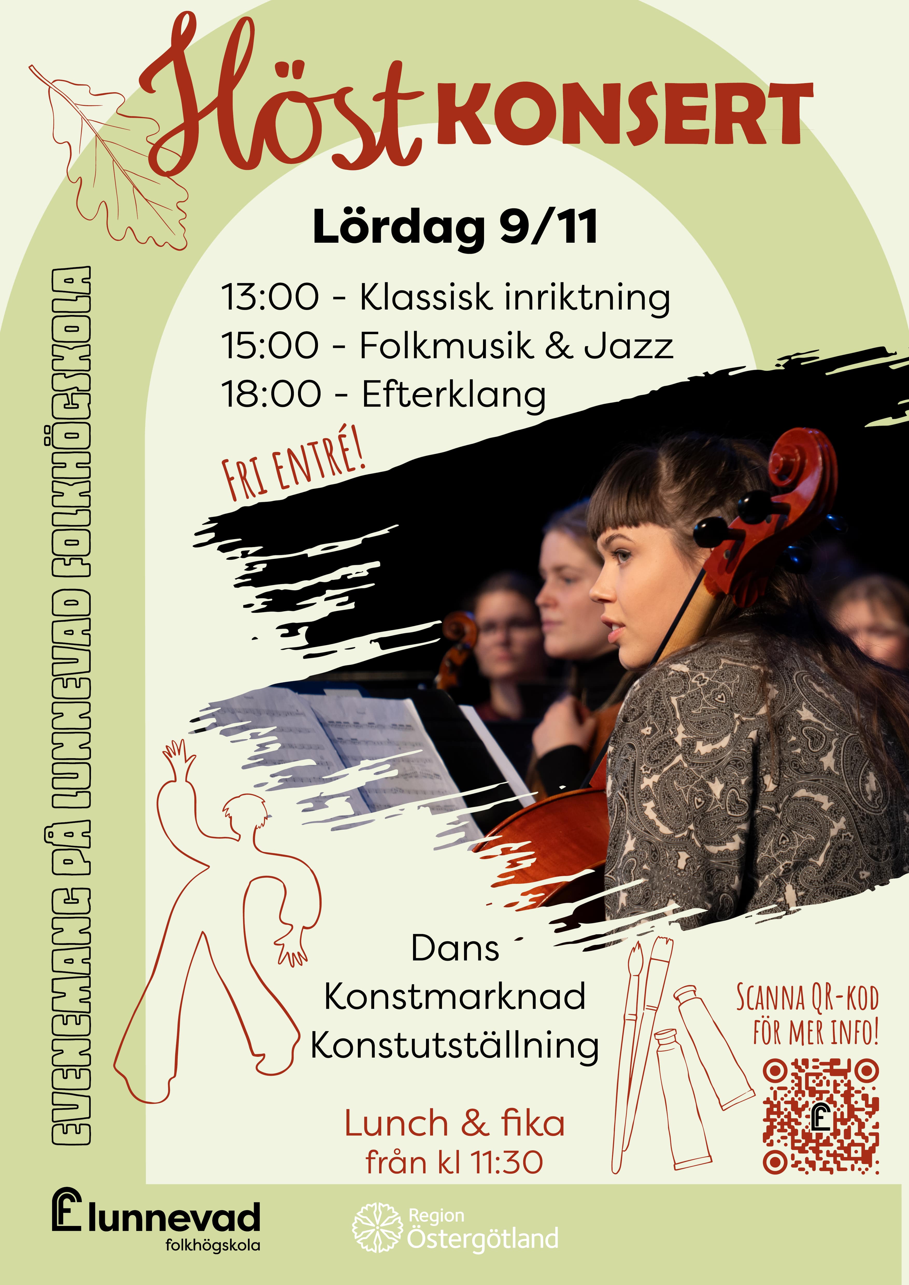 Musiklinjens årliga höstkonsert på Lunnevad. Konserter med de stora ensemblerna från inriktningarna jazz, folkmusik och klassisk musik. Konstlinjen har utställning och konstmarknad under dagen. Danslinjens har uppvisning följande tider: kl. 12.15 - Pappadans, ett danskoncept av [...] |