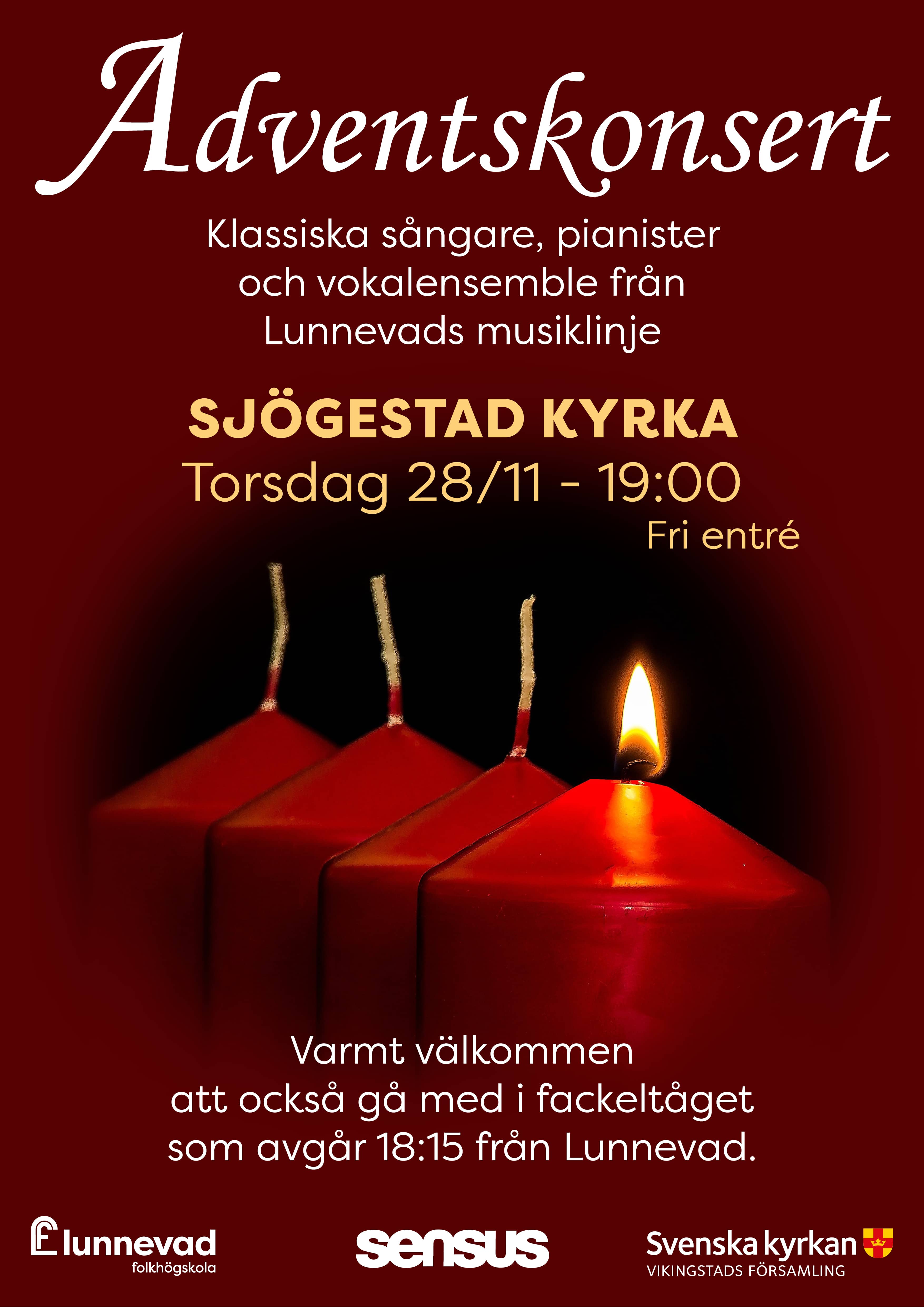 Klassiska sångare, pianister samt vokalensemblen ger Adventskonsert i Sjögestad kyrka kl 19:00. Fackeltåg avgår från Lunnevad till kyrkan kl 18:15. |