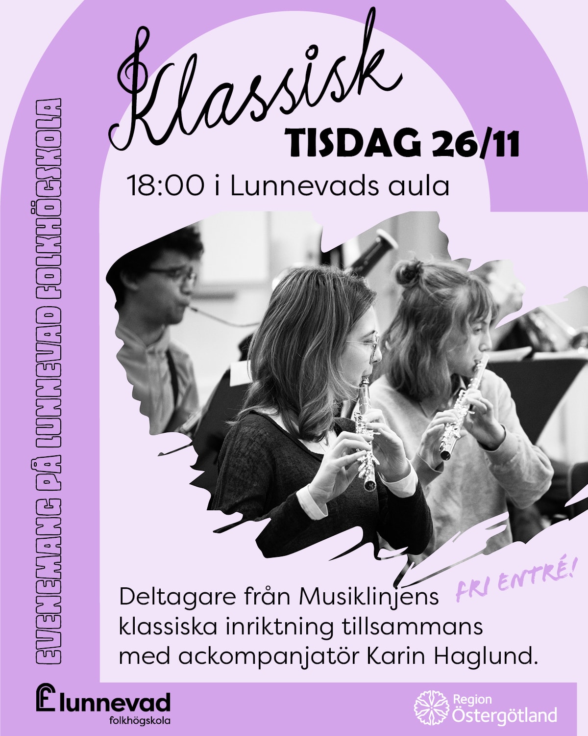 Klassisk tisdag i Lunnevads aula kl 18.00. Deltagare från musiklinjens klassiska inriktning bjuder på ett blandat program ur den klassiska repertoaren tillsammans med ackompanjatör Karin Haglund. |