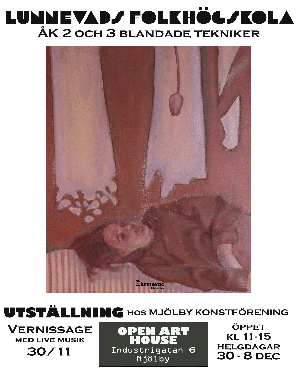 Mjölby Open Art House Industrigatan 6, Mjölby, ÖstergötlandKonstlinjen år 2 & 3 har vernissage lördag 30/11, kl 11 - 15 på Mjölby Open Art House. Utställningen pågår fram till 8/12, öppet lördag - söndag kl 11 - 15. Välkomna!
