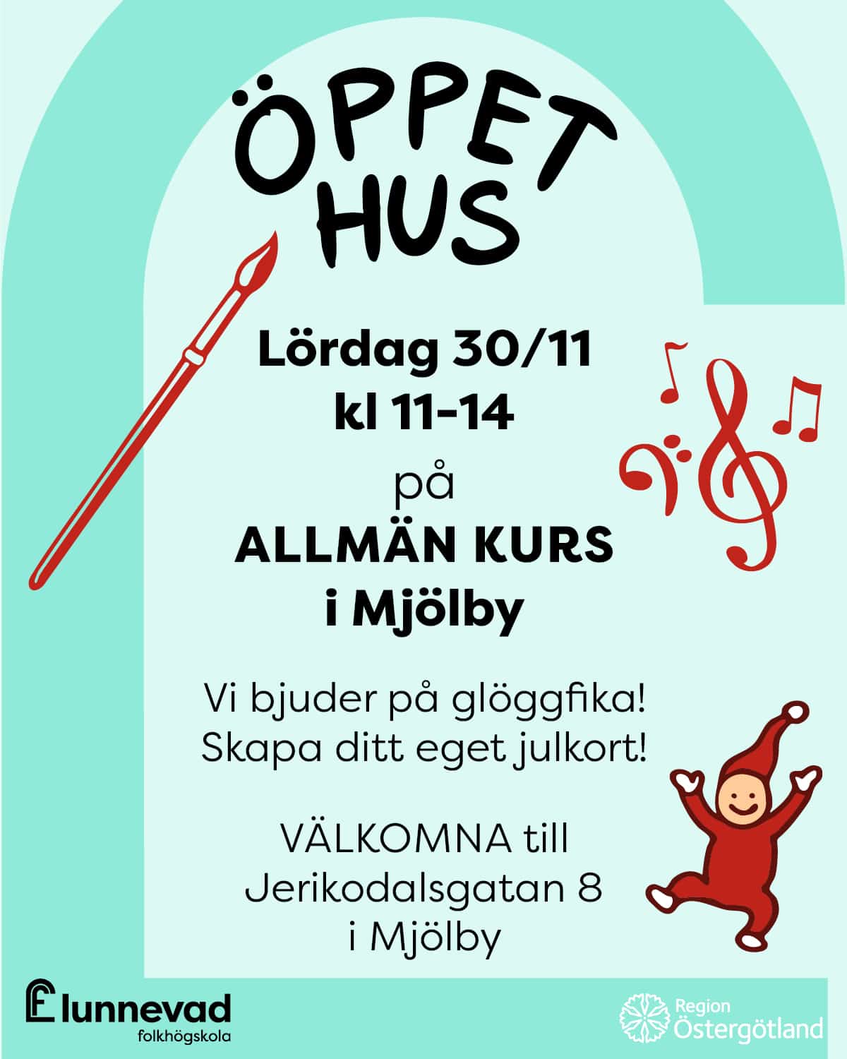 Jerikodalsgatan 8, MjölbyAllmän kurs i Mjölby har öppet hus lördag 30/11 kl 11-14. Välkomna till våra lokaler på Jerikodalsgatan 8 i Mjölby. Vi bjuder på glöggfika och du får möjlighet att skapa eget julkort!
